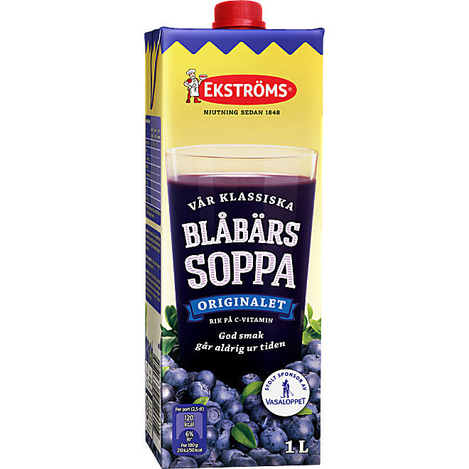 Ekströms blåbärssoppa - en svensk klassiker som vi kallar Originalet. Lika uppskattad hemma som i skidspåret när du är på jakt efter mer energi eller bara vill ha ett mättande mellanmål. Mixa gärna soppan med banan för en snabb och välsmakande smoothie! Rik på C-Vitamin. Ekströms är Vasaloppets äldsta sponsor och sedan 1958 har Vasaloppsåkare kunnat stärka sig med denna goda soppa för att få ny energi. Besök ekstroms.se för att läsa mer om Ekströms historia och alla produkter. God smak går aldrig ur tiden!