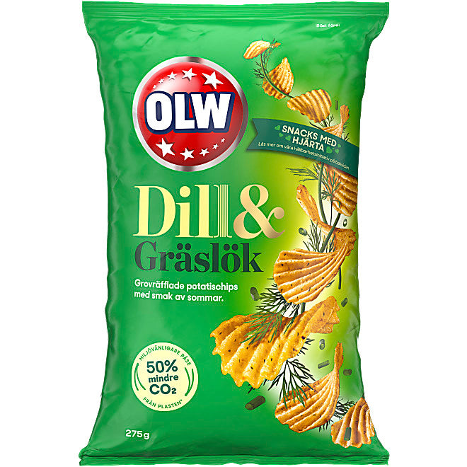 Riktigt goda chips gör fredagsmyset ännu bättre. På OLW använder vi oss av naturliga ingredienser och den allra finaste potatisen. Dessutom gör vi våra chips riktigt OLW-krispiga – allt för den goda smakens skull. OLW:s Dill & Gräslök chips för tankarna till den svenska sommaren med sin kryddning av dill och gräslök. Utsökt!