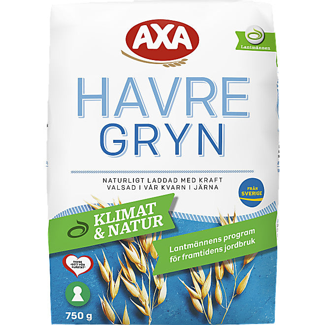 AXA Havregryn är en älskad favorit som kan användas som bas till allt från goda frukostar som gröt, müsli och granola till läckra bakverk. Våra älskade havregryn är fullproppad med fullkorn, rik på mineralerna järn och zink samt vitaminerna tiamin och folsyra. Inte konstigt att havregryn är en svensk klassiker. Våra havregryn är dessutom odlade och producerade i Sverige samt nyckelhålsmärkta! Dessa havregryn är en del av Lantmännens Klimat & Natur odlingsprogram, från havre som är odlat med lägre klimatpåverkan. Det innebär att när du väljer att använda dessa havregryn bidrar du till att Lantmännen kan odla spannmål med mer hållbara metoder.