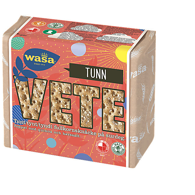 Tunn Vete - ett tunt och krispigt fullkornsknäcke bakat på surdeg och toppat med quinoa och havssalt. Brödet har en rund och mild smak som gör sig bra med såväl klassiska pålägg som mer matiga toppings. Tunn vete är bakat på 52% fullkornsvetemjöl och är märkt med nyckelhålet. Som Wasas hela sortiment är även Tunn vete 100% klimatkompenserat