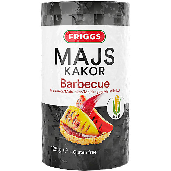 Friggs Majskakor Barbecue är glutenfria majskakor med en god smak av barbecue. Passar gott som ett hälsosammare snacks eller som mellanmål vart du än är.